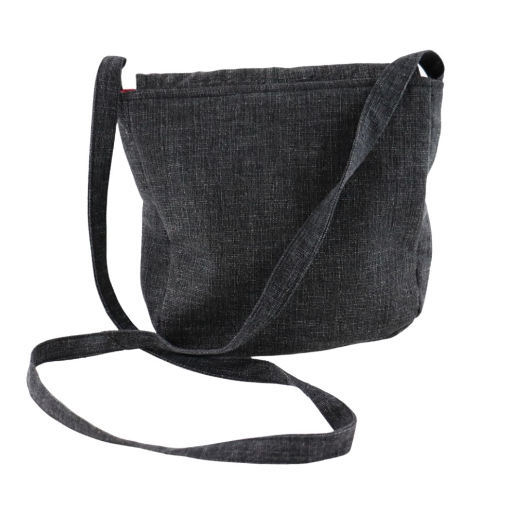 The approximate dimensions are L24cms x H26cms x W4cms. The strap is 97cms long. Each bag is lined with bright pink cotton poplin. There are internal pockets on both sides. Velcro fastens the front flap.