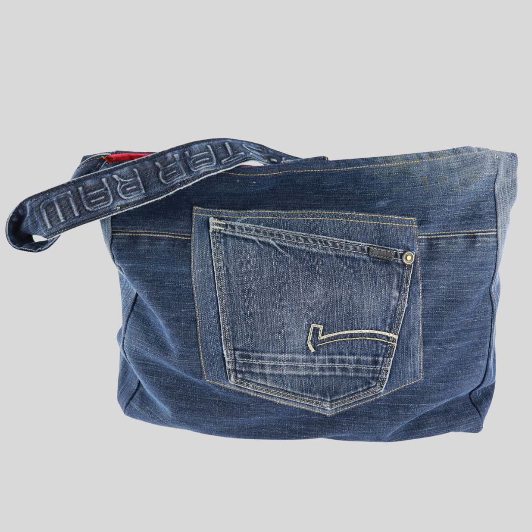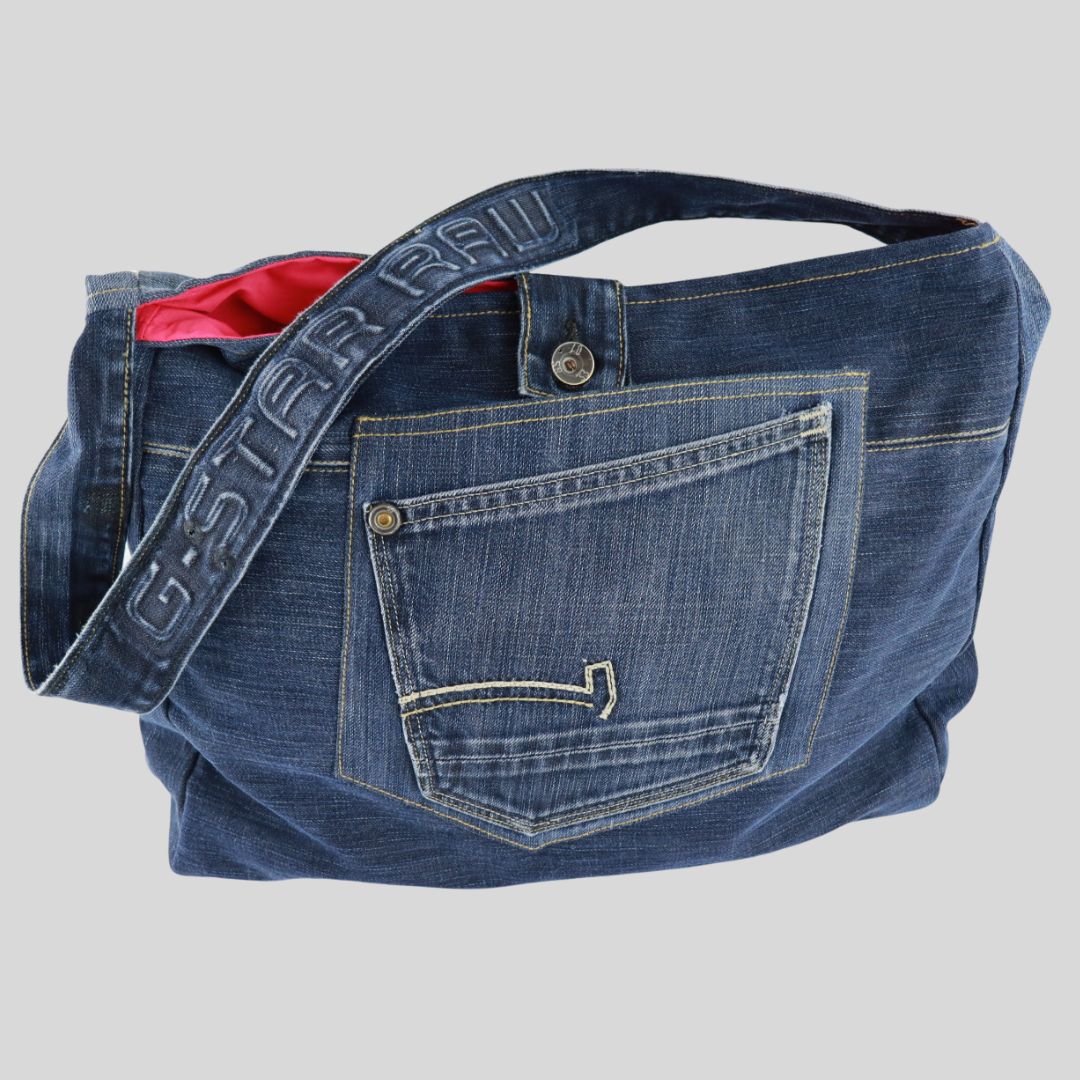 Made from G-Star Raw jeans.The approximate dimensions are L44cms x H36cms x W8cms. The strap is 94cms long. Each bag is lined with pink cotton poplin. There are internal pockets on both sides.