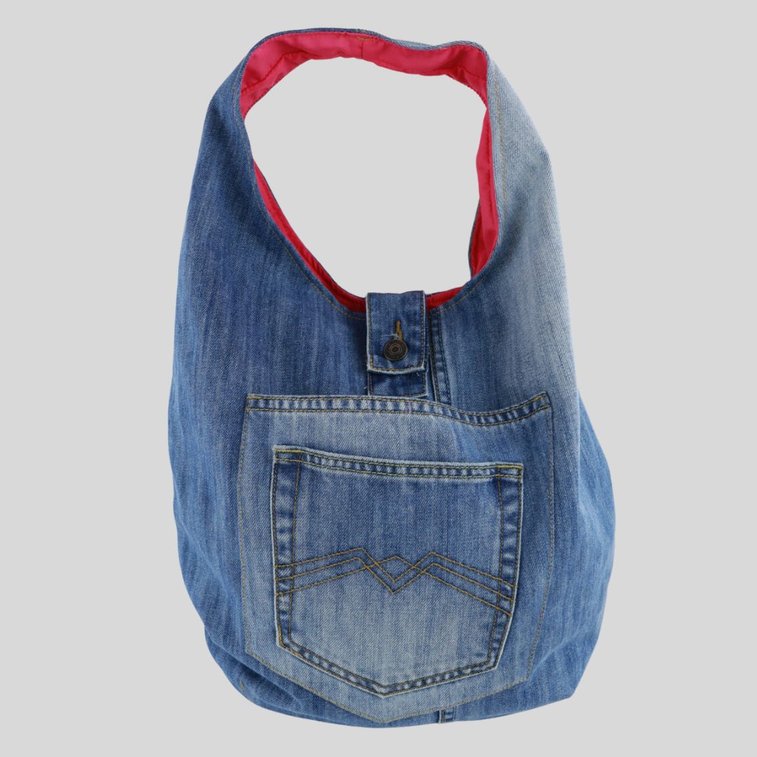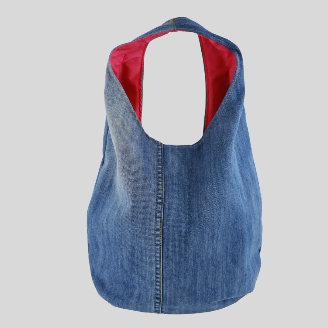 Made from jeans. The approximate dimensions are L40cms x H35cms. Each bag is lined with pink cotton poplin. There are internal pockets on both sides.