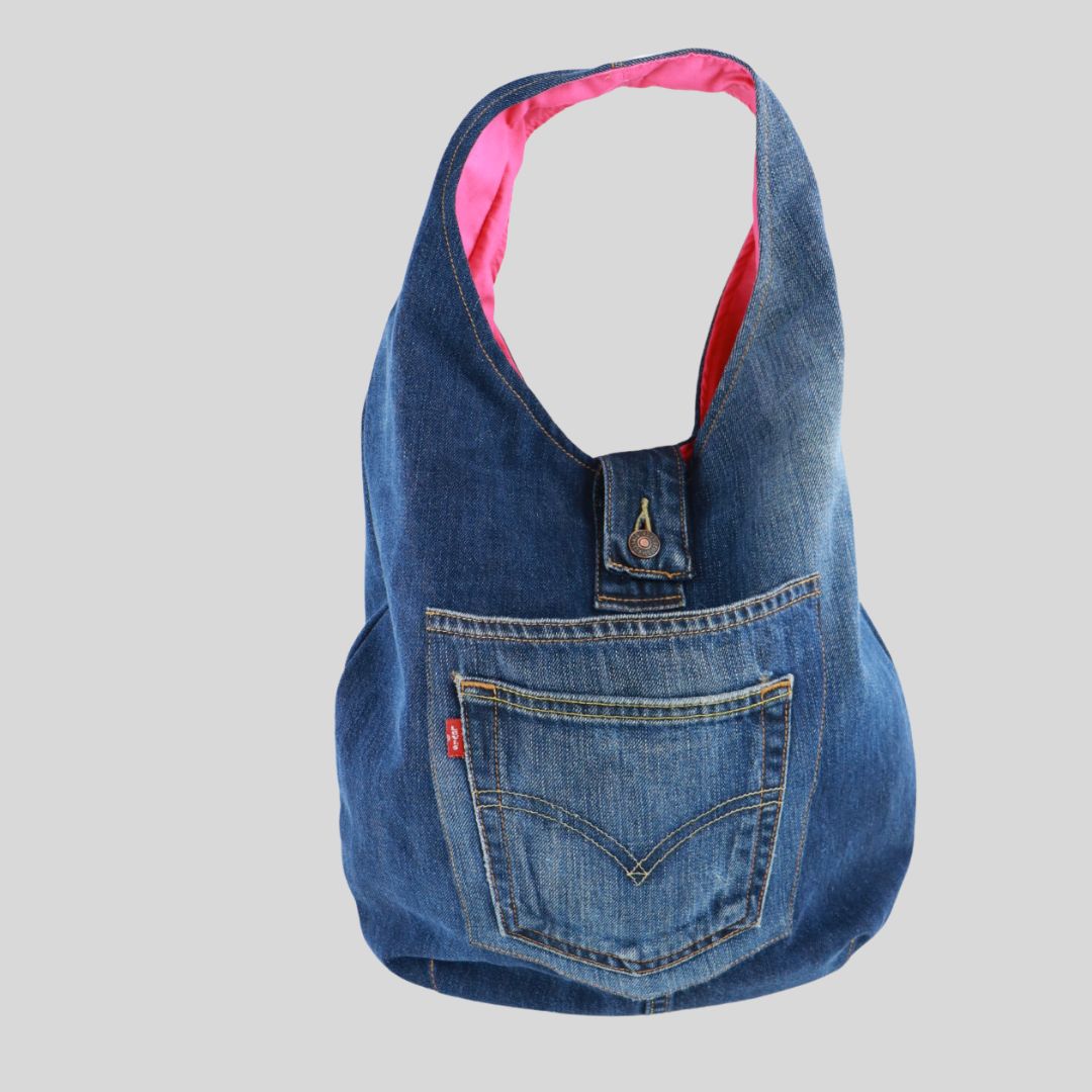 Made from Levi Strauss jeans. The approximate dimensions are L40cms x H35cms. Each bag is lined with pink cotton poplin. There are internal pockets on both sides.