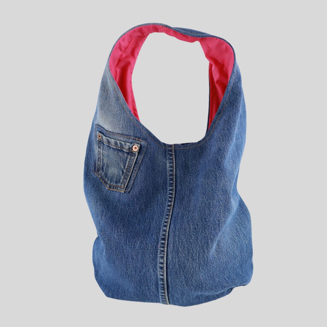 Made from Levi Strauss jeans. The approximate dimensions are L40cms x H35cms. Each bag is lined with pink cotton poplin. There are internal pockets on both sides.