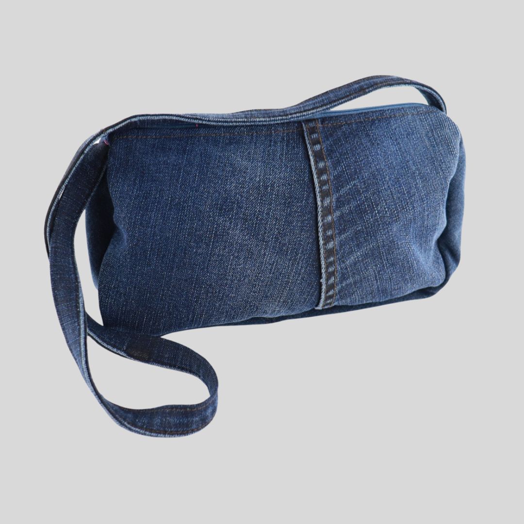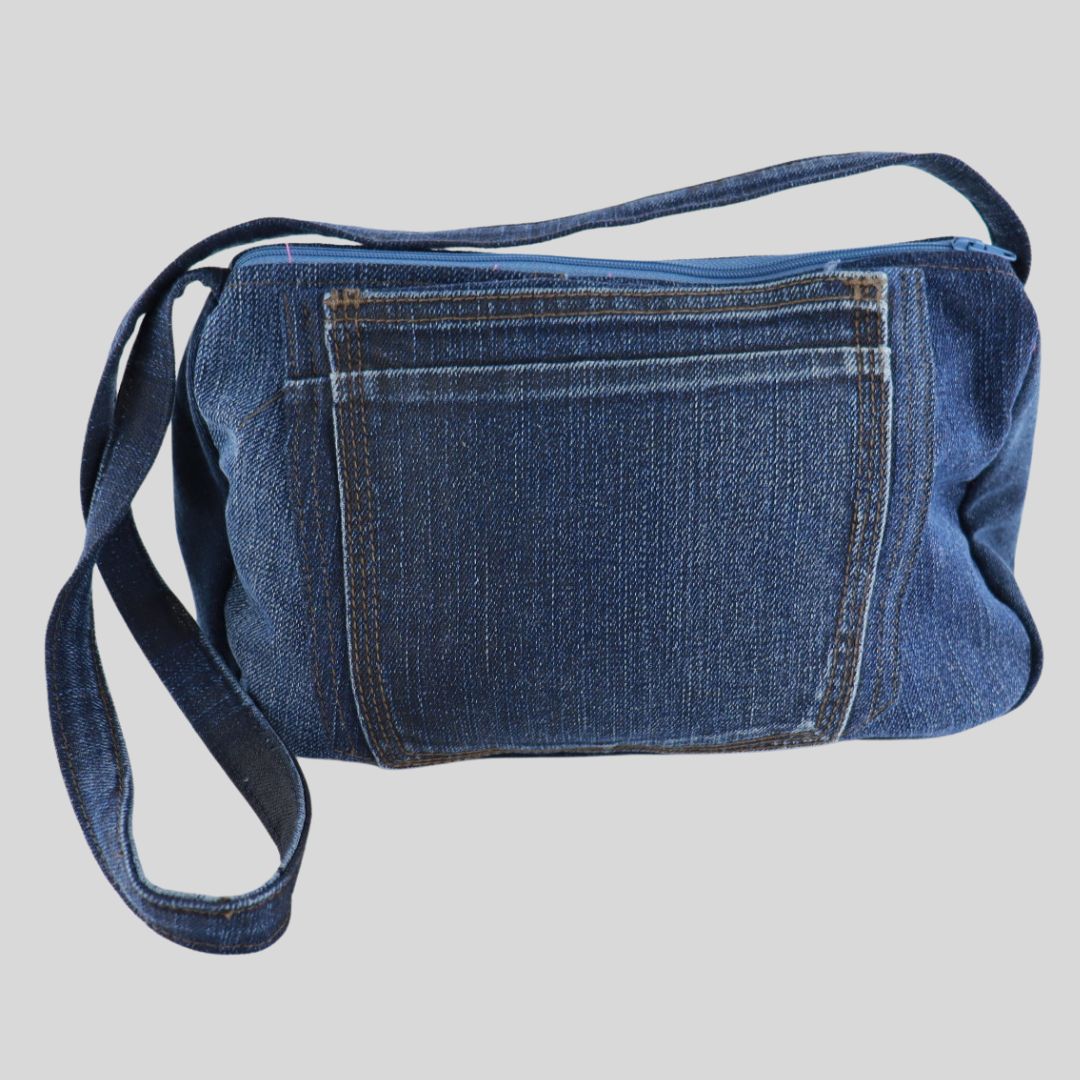Made from jeans. The approximate dimensions are L30cms x H17cms x W8cms. The strap is 79cms long. Each bag is lined with pink cotton poplin. There are internal pockets on both sides. A zip to fasten.