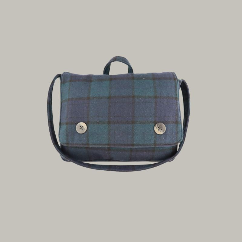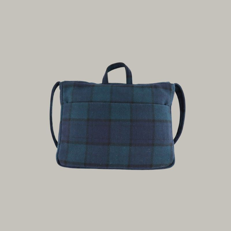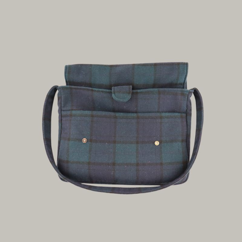 It measures 43 cms long and 32 cms tall, 6 cms deep. Our bags are fully lined. Two internal pockets, a padded separator and a rear external pocket. It fastens with three magnetic closures. Shoulder strap and carry handle.